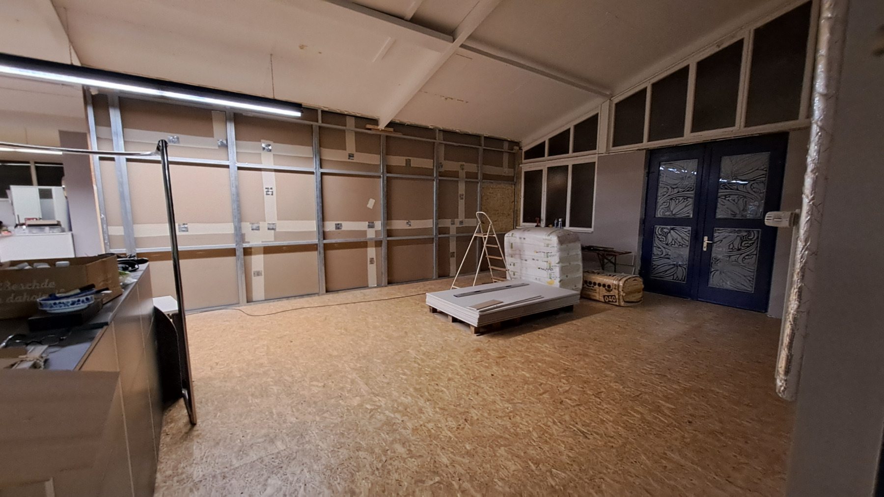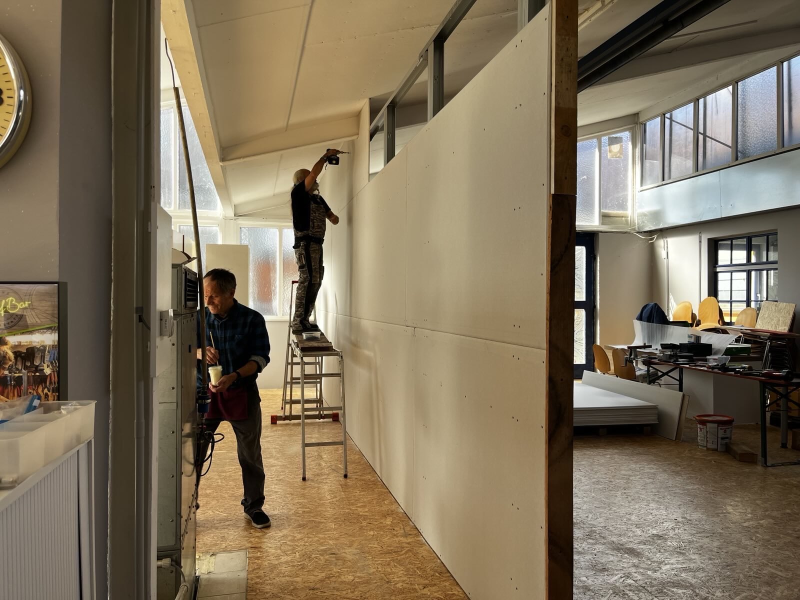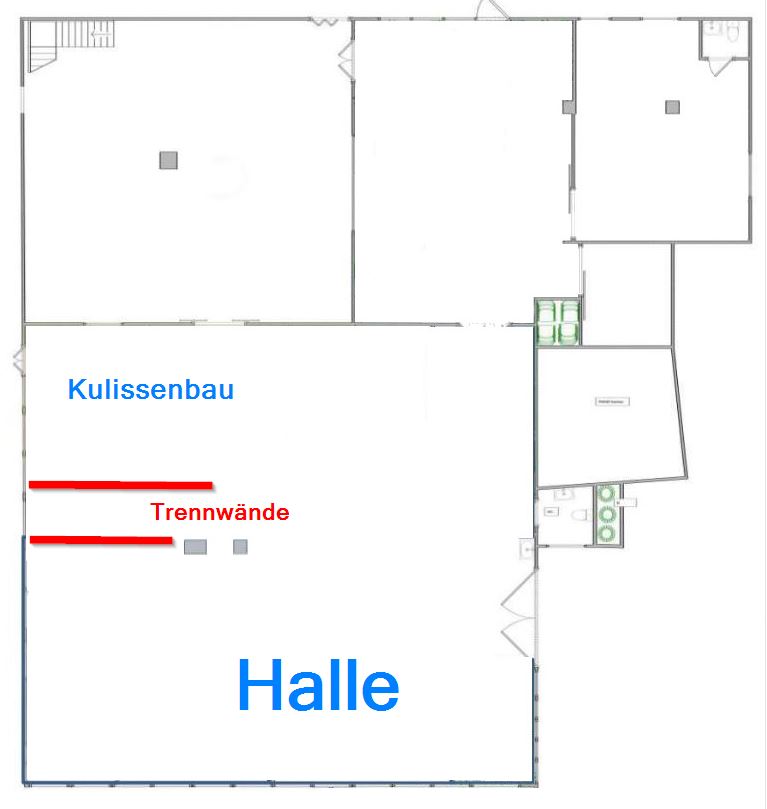 Alktuell ist die Trennwand zwischen Kulissenbau und dem Fablab im Bau: es fehlt noch die Wandplatten auf der Seite des Kulissenbau und die Verlegung von Stromkabeln und Steckdosen; am Ende der Wand wird ein Verteilerkasten installiert.