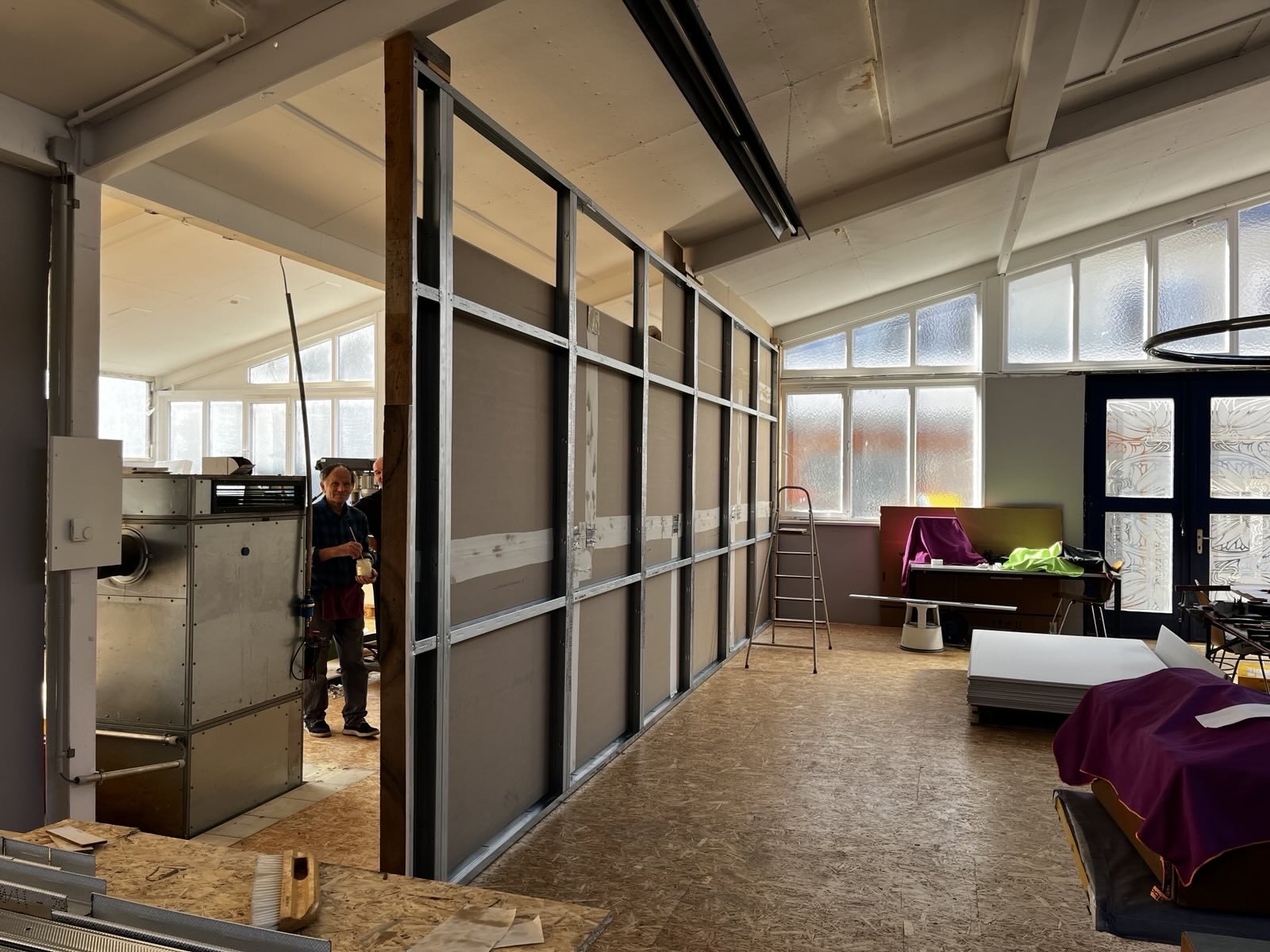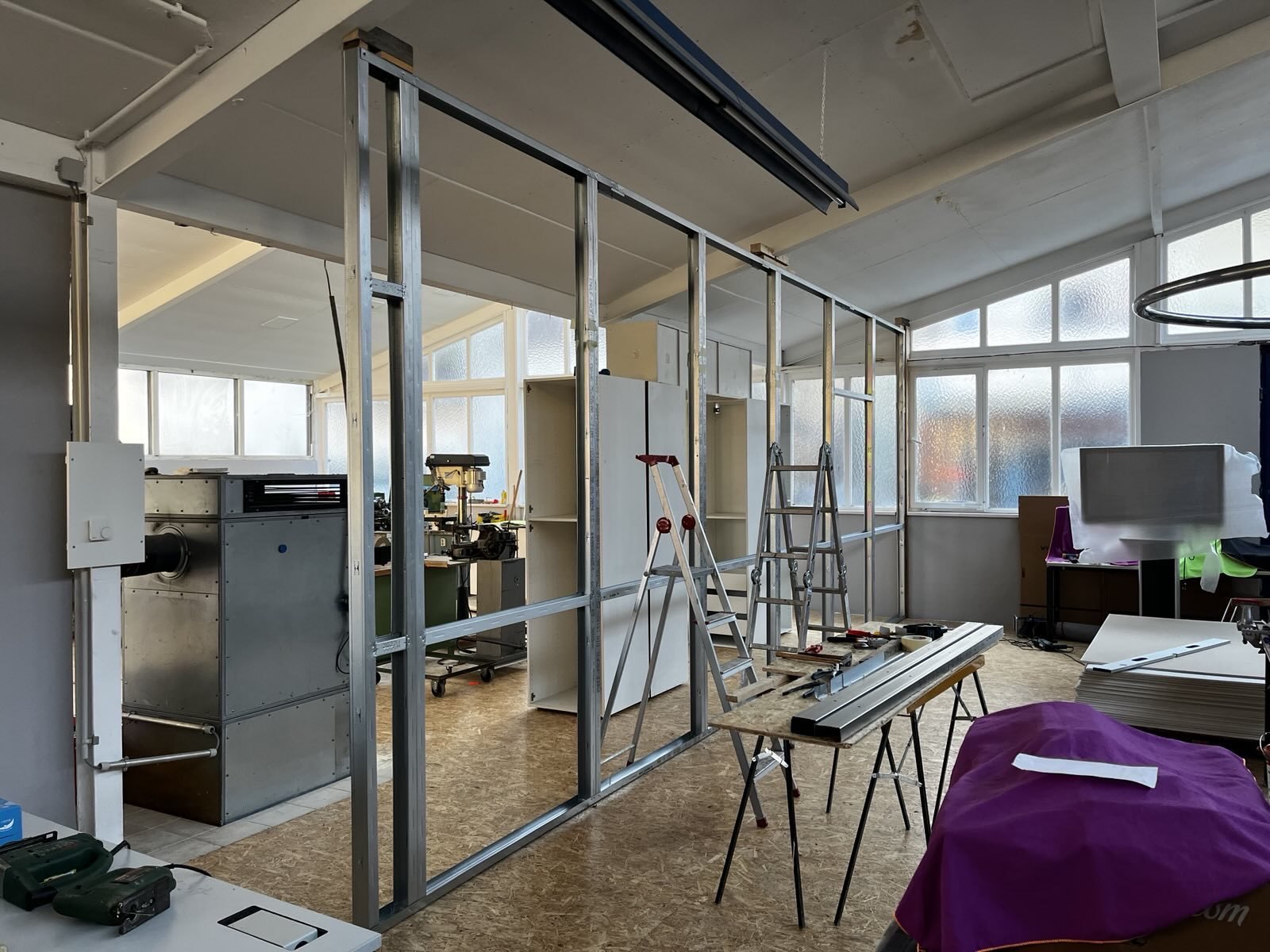 Die Trennwände – zwischen dem Kulissenbau und dem Fablab/Holzbereich – entsteht gerade.