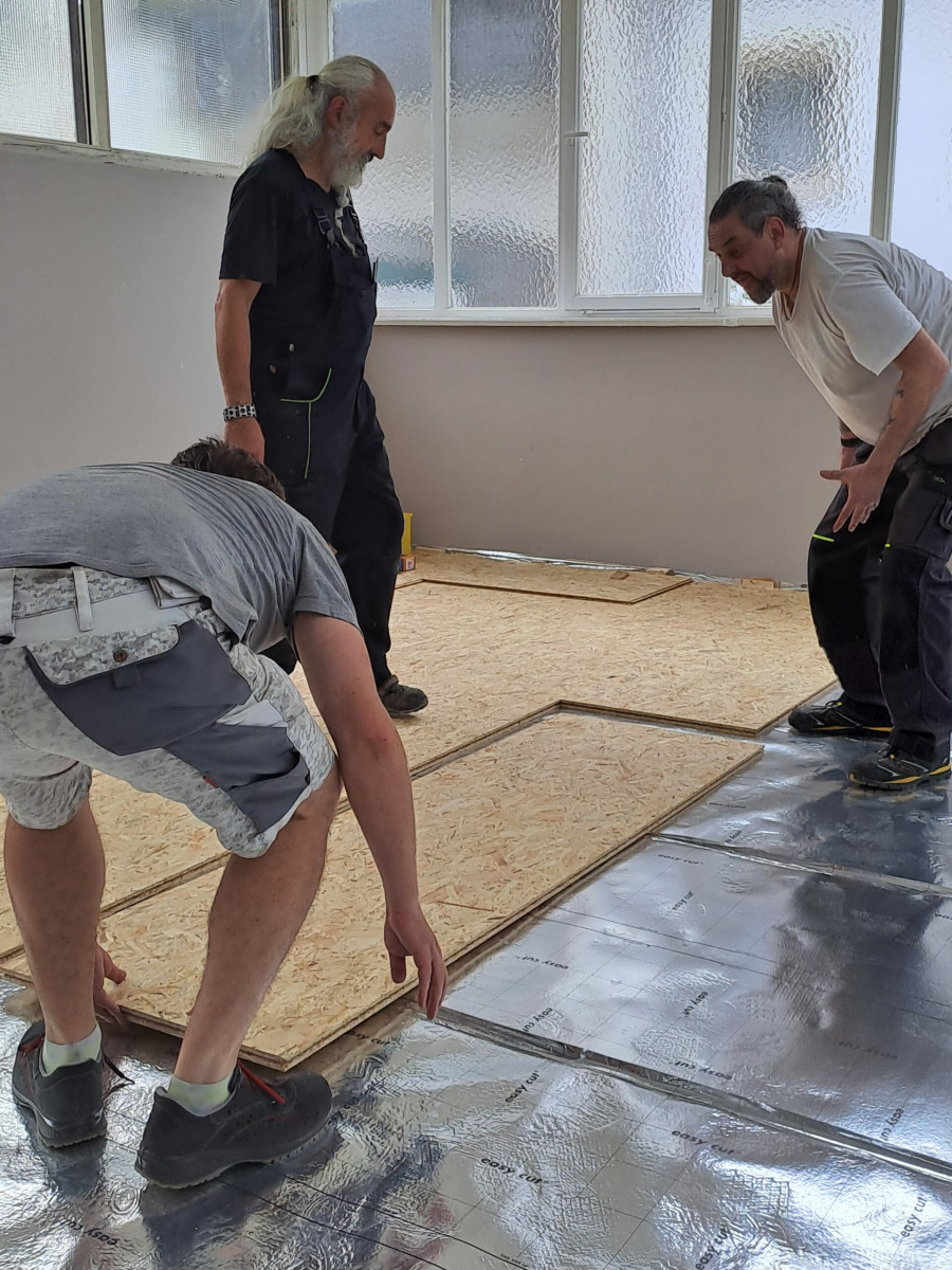 Gestern hat ein fleissiges Team begonnen in der Halle den Boden zu verlegen.