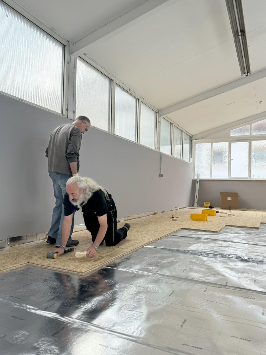 Gestern hat ein fleissiges Team begonnen in der Halle den Boden zu verlegen.