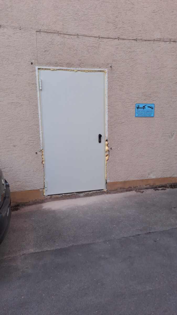 Nun wurde die endgültige Fluchttür fachgerecht eingebaut. Diese entspricht den geltenden Sicherheitsvorschriften und stellt sicher, dass der Fluchtweg dauerhaft nutzbar und normgerecht gesichert ist.