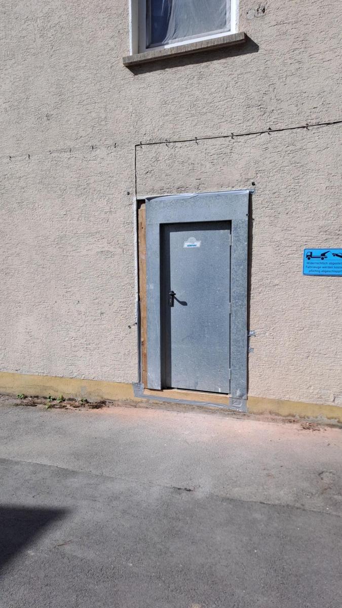 Nun wurde die endgültige Fluchttür fachgerecht eingebaut. Diese entspricht den geltenden Sicherheitsvorschriften und stellt sicher, dass der Fluchtweg dauerhaft nutzbar und normgerecht gesichert ist.