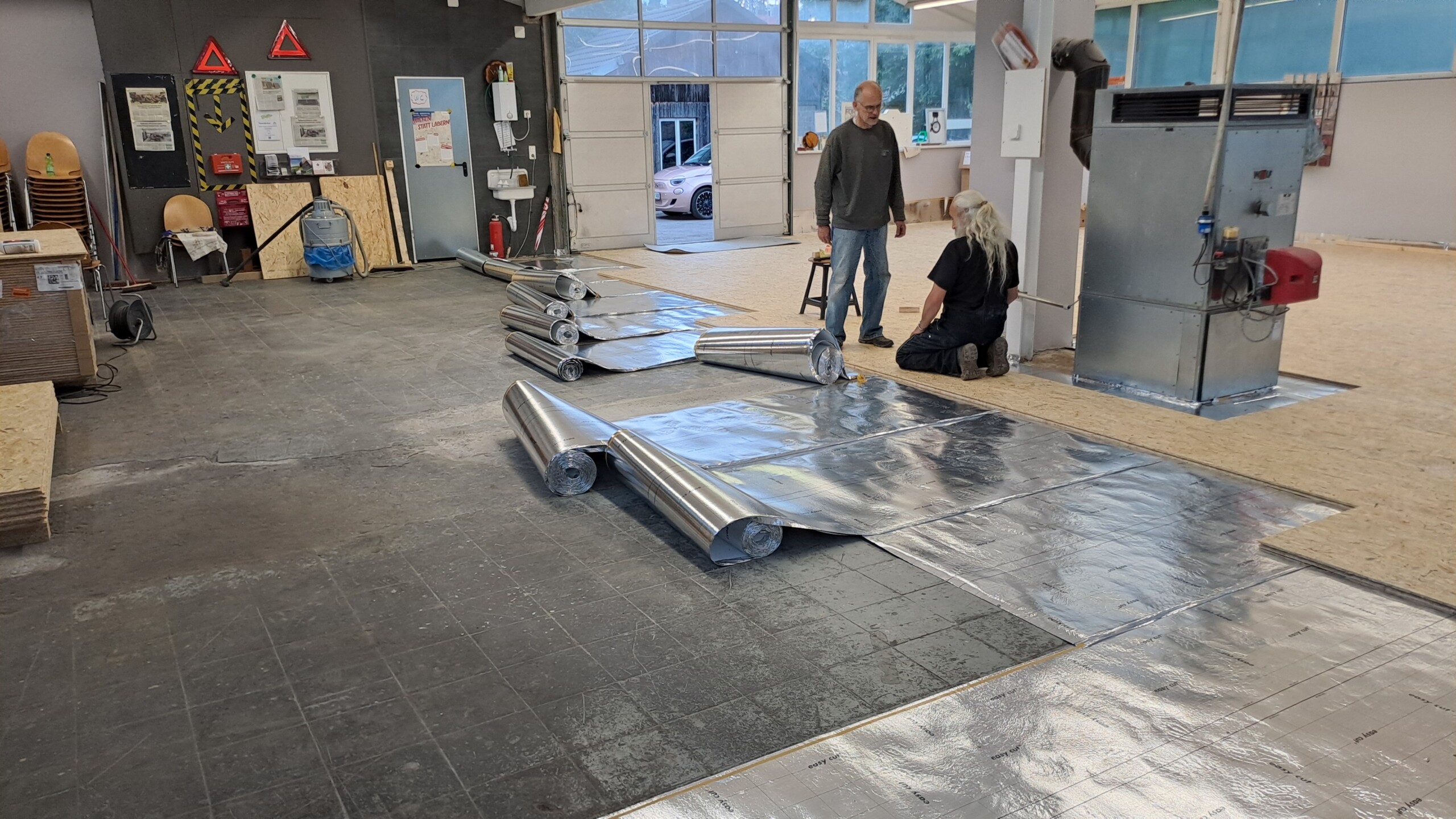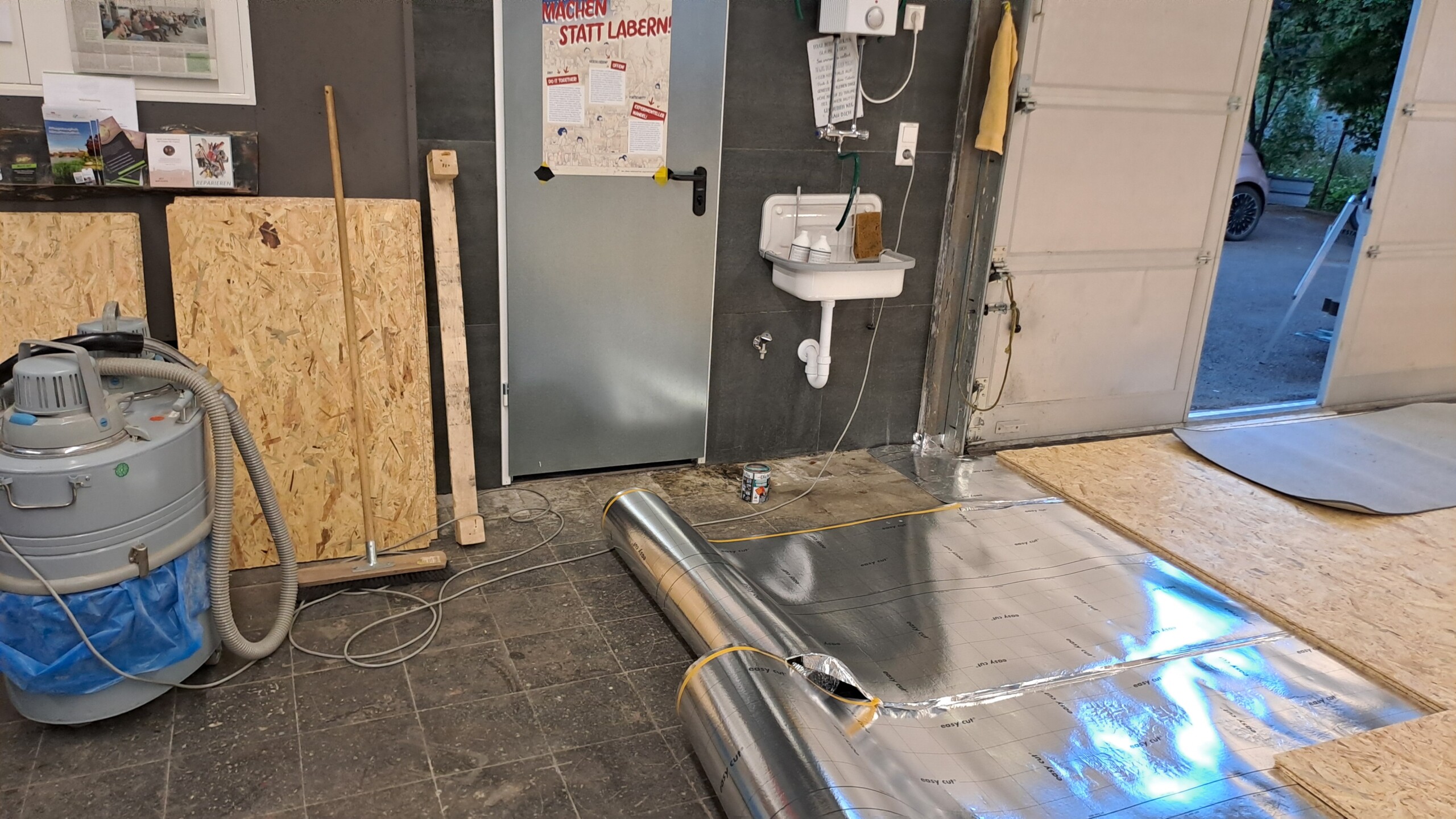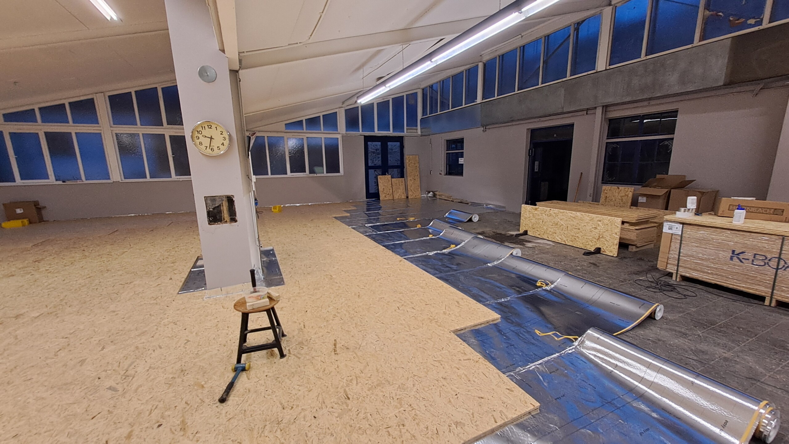 Auch am Montag Abend hat ein kleines Team weitere Teile des Hallenboden verlegt.