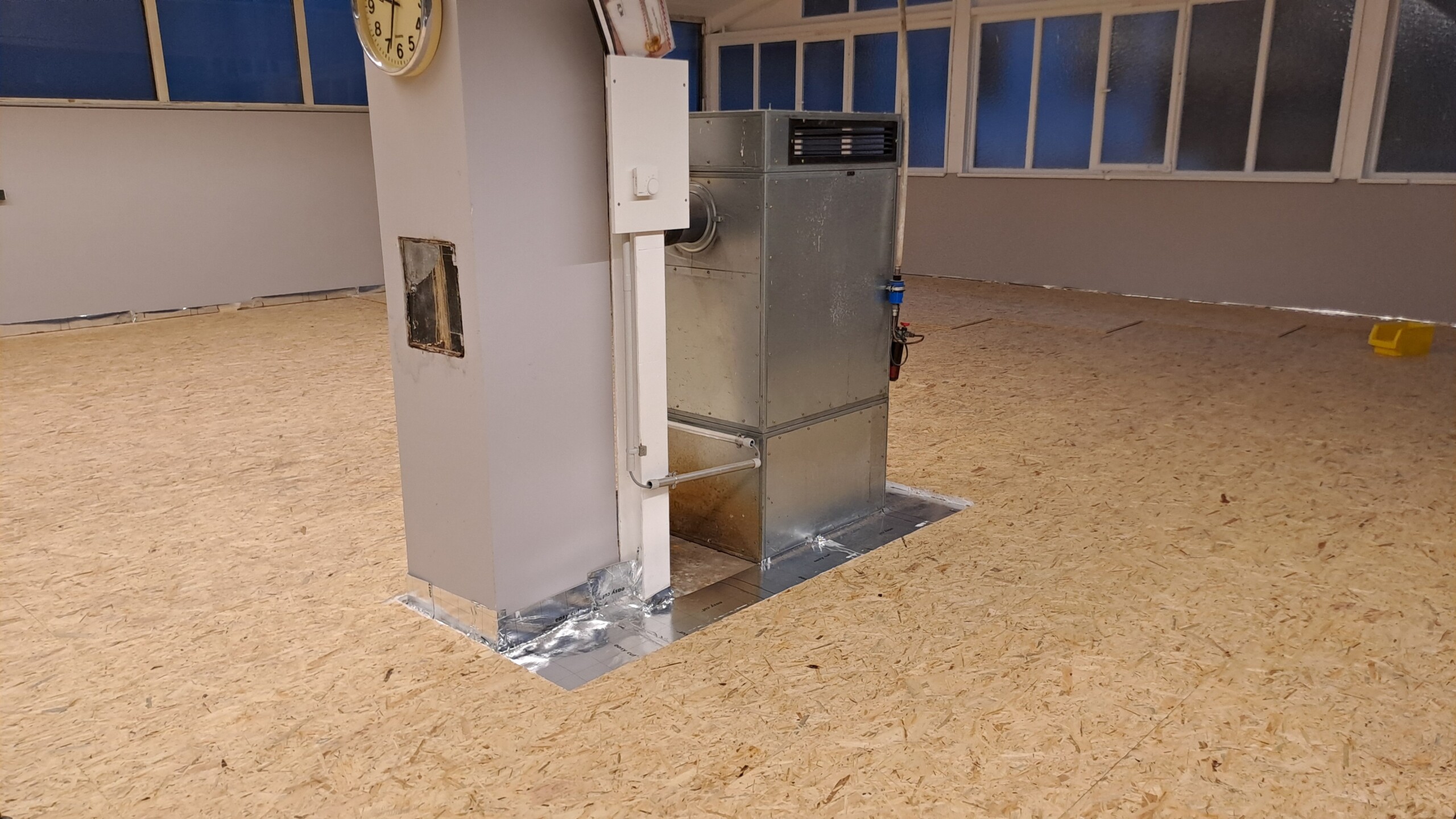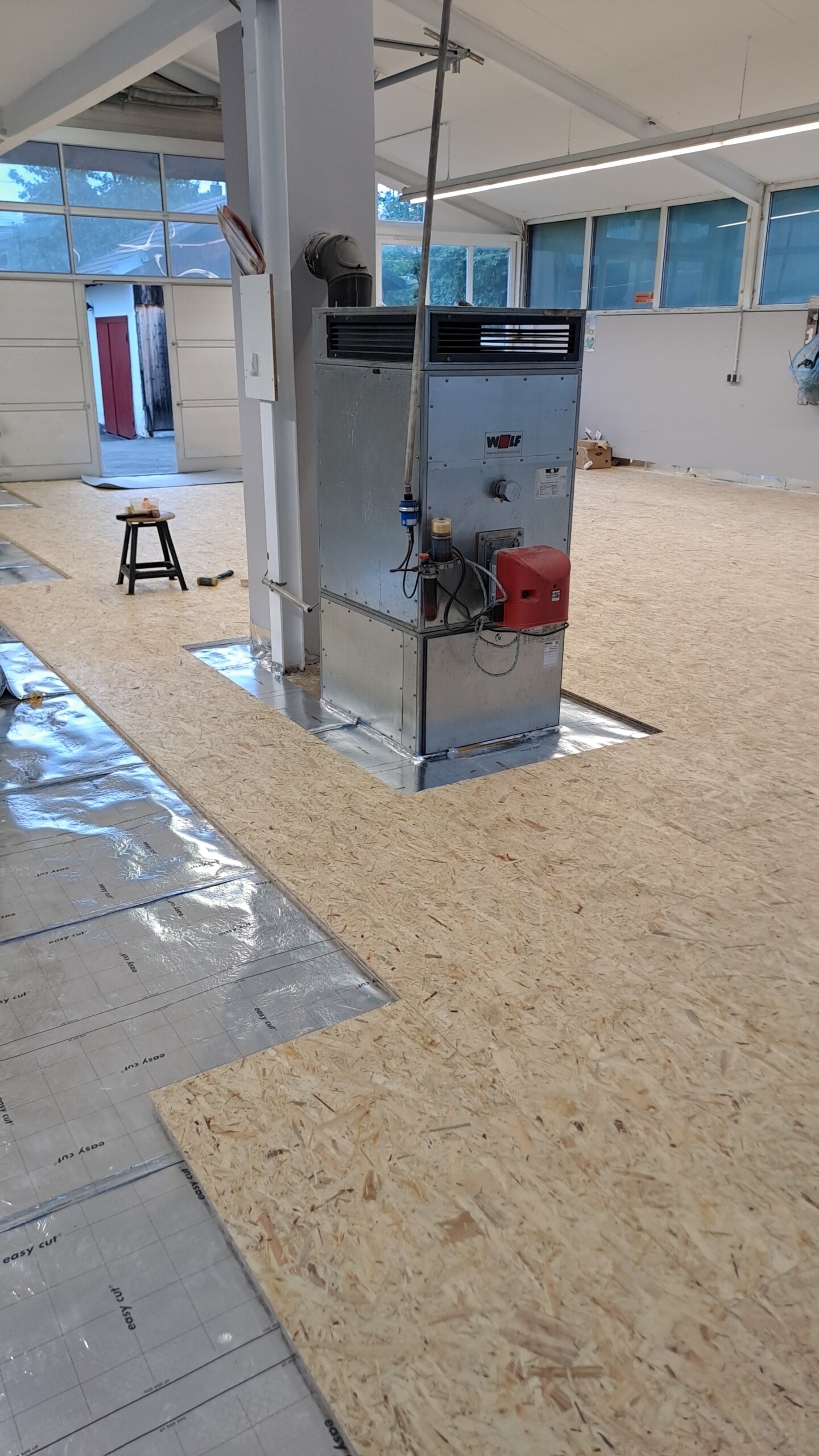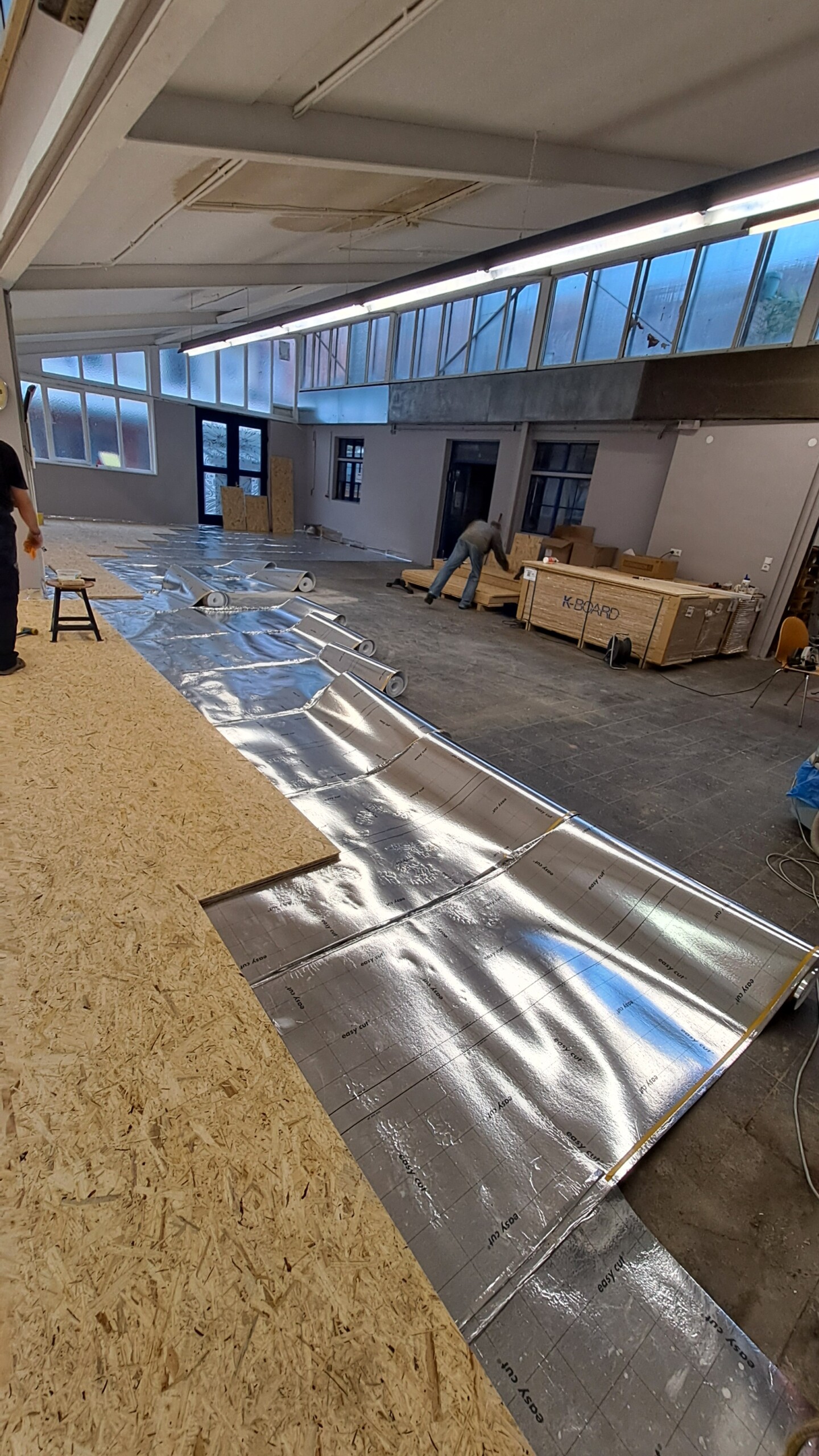 Auch am Montag Abend hat ein kleines Team weitere Teile des Hallenboden verlegt.